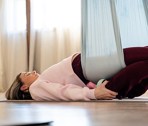 Aerial Yin Deeply calming and fully supported, this meditative class blends the principles of yin yoga with the nurturing hold of the hammock. You’ll settle into long-held, passive shapes that target fascia, joints, and energetic pathways, inviting deep release and stillness. Aerial Yin is a grounding practice that encourages nervous system reset and inner spaciousness — a beautiful way to restore and unwind.